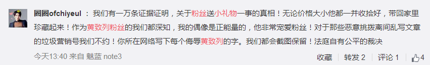 冬粉曬出自己送給黃致列的小禮物另外,網友也紛紛表示支持黃致列和其工作室,稱要抵制不實傳言,拒絕網路暴力,“請還網路一片淨土”。