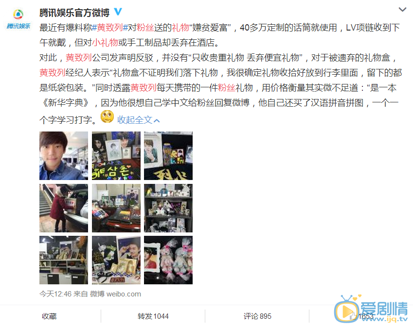 冬粉曬出被黃致列丟在酒店的禮物今日中午,黃致列工作室發表聲明譴責這一訊息,稱這種說法是“未經調查,主觀臆斷,無中生有誤導輿論”,將採取法律手段維護藝人的權益。工作室同時表示,黃致列對冬粉如朋友家人一般,將冬粉的禮物視若珍寶,還經常和冬粉交換禮物。
