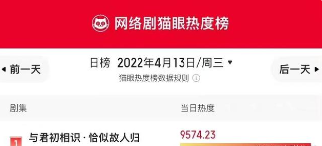 《恰似故人歸》播出至今,熱度一直很好,是優酷首部熱度破萬的高分劇集。在貓眼熱度榜上,它的排名也一直很好,穩居第一位。