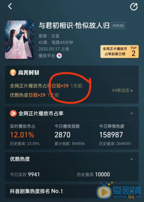 要知道《恰似故人歸》開播已經已經連續拿下了29次日冠軍的位置了,也就意味著打從開播以來一直都是榜首,沒有一部網劇能夠與之抗衡的,甚至上星劇都一樣照超。只能說對於如今《恰似故人歸》即將大結局,猶如人老了一樣,是該把位置讓給其他年輕人了。