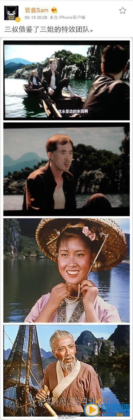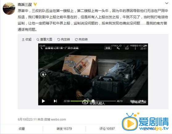 @南派三叔:原著中,三叔的隊伍坐在第一艘船上,第二艘船上有一頭牛,因為牛的原因導致他們無法在屍洞中後退,我們看到劇中上船之前牛是在的,但是所有人上船出發之後,牛就不見了,當時我打電話給監製,讓他一定把箱子和牛弄上船,監製說沒問題的,後來我發現他確實沒問題 ......是我的南方國語有問題。