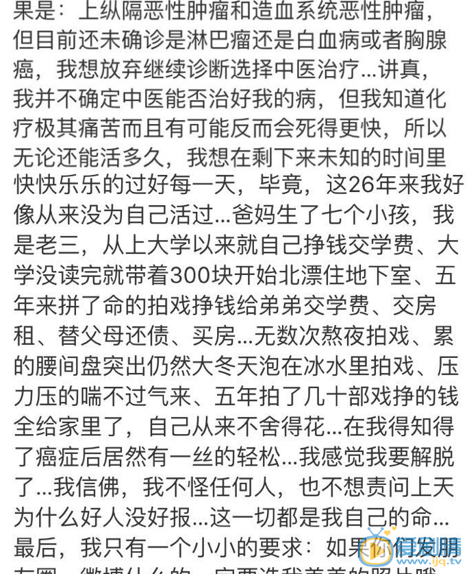 演員徐婷曾經出演過《老爸回家》《把愛帶回家》等劇。而此前,直到7月9日,徐婷才在微博上公開自己患病的事實,這條至今仍然置頂的微博寫到:“這些天我和我的家人都根本無法相信這個事實,包括現在我自己都還不敢相信這種事會發生在我的身上。”並透露,自己是家中七個小孩的老三,上大學以來就自己掙錢交學費,曾經帶著300塊錢開始了北漂住地下室的生涯。
