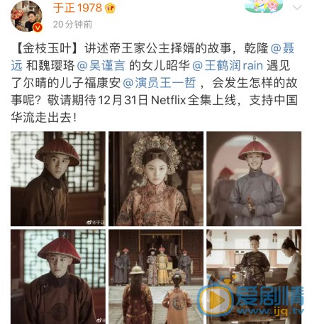 劇情簡介 分集劇情 演員表 播出時間 金枝玉葉 主演:王鶴潤 王一哲 聶遠 吳謹言 王宇威 許曉諾 蔣冰 龐國昌 徐熙顏 夏台鳳 寇振海 黃梅瑩 於毅 田海蓉 配音狄菲菲 趙子琪 高雄 張萌 林保怡 配音沈磊 翟天臨 苗僑偉 配音桂楠 別名:金枝玉葉電視劇 導演:於正 編劇:於正 類別:古裝 集數:共36集 劇情更至第3集 金枝玉葉劇情簡介 《金枝玉葉》講述的是帝王家公主擇婿的故事,也就是乾隆皇帝和令妃娘娘魏瓔珞的女兒,和喜塔臘爾晴的兒子福康安之間愛恨情仇的故事。 金枝玉葉分集劇情 第1集 第2集 第3集 金枝玉葉演員表 昭華王鶴潤飾 福康安王一哲飾 乾隆聶遠飾 魏瓔珞吳謹言飾 拉旺多爾濟王宇威飾 思婉格格許曉諾飾 賀文強蔣冰飾 鑽石雕刻師龐國昌飾 Sandy徐熙顏飾 邵立紅夏台鳳飾 林志成寇振海飾 沈曼婷黃梅瑩飾 杜川於毅飾 玉歡田海蓉 配音狄菲菲飾 玉璇趙子琪飾 金慶元高雄飾 玉琪張萌飾 邵立達林保怡 配音沈磊飾 金天勝翟天臨飾 金天橋苗僑偉 配音桂楠飾 金枝玉葉電視劇劇情看點 《延禧攻略》番外篇《金枝玉葉》播出 魏瓔珞上演嫁女精彩大戲 金枝玉葉主要講述了什麼劇情?主要陣容有誰? 《延禧攻略》番外篇來襲 《金枝玉葉》確定定檔時間
